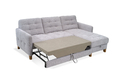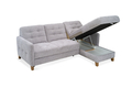 Kompaktowy narożnik idealnie pasujący także do mniejszych salonów, z wygodną funkcją spania typu DELFIN oraz pojemnikiem na pościel. Mebel ma modny wąski boczek, a jego siedzisko, oparcie i bok są zdobione geometrycznymi przeszyciami.